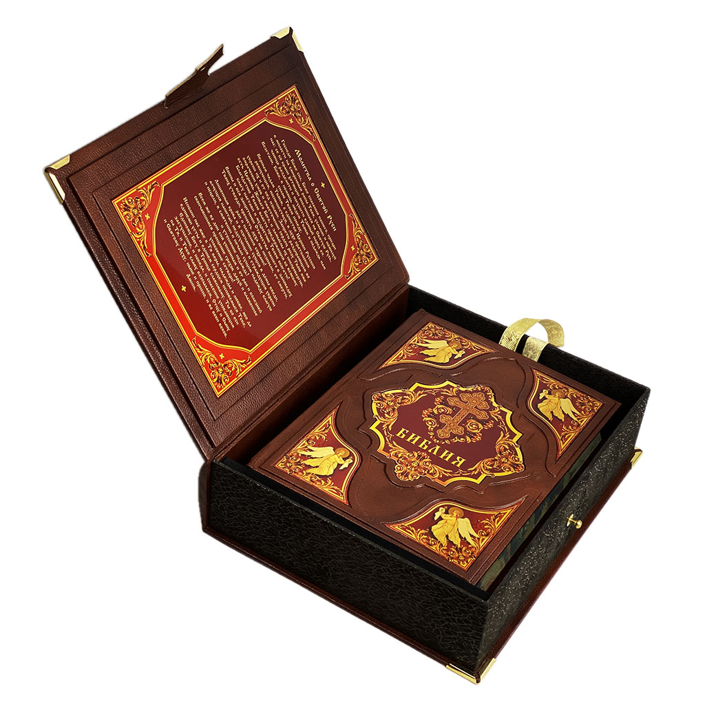 Величие священного текста подчеркнуто его безупречным материальным воплощением. Наше эксклюзивное издание представлено в цельнокожаном переплете ручной работы, выполненном с использованием благородных материалов и традиционных переплетных техник. Книга помещена в оригинальный подарочный футляр, обтянутый кожей, что обеспечивает ее сохранность и подчеркивает особую ценность. Это безусловный образец элитные издания книг, в котором каждая деталь говорит о высочайшем качестве и уважении к слову Божию. Такие подарочные книги в кожаном переплете — идеальный, по-настоящему духовный подарок на крещение, венчание, именины или другой значимый праздник.
