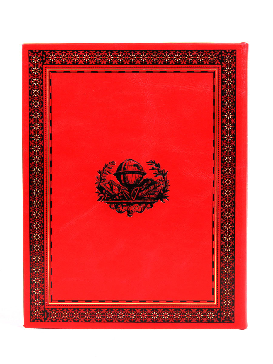 Цельнокожаный переплёт ручной работы, украшен цветной кожаной вставкой, а также цветным и