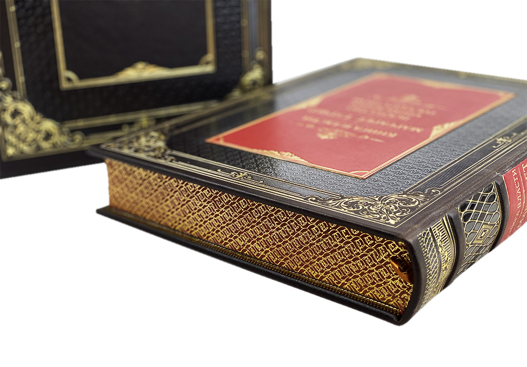 Цельнокожаный переплёт ручной работы, украшен цветной кожаной вставкой, а также золотым и