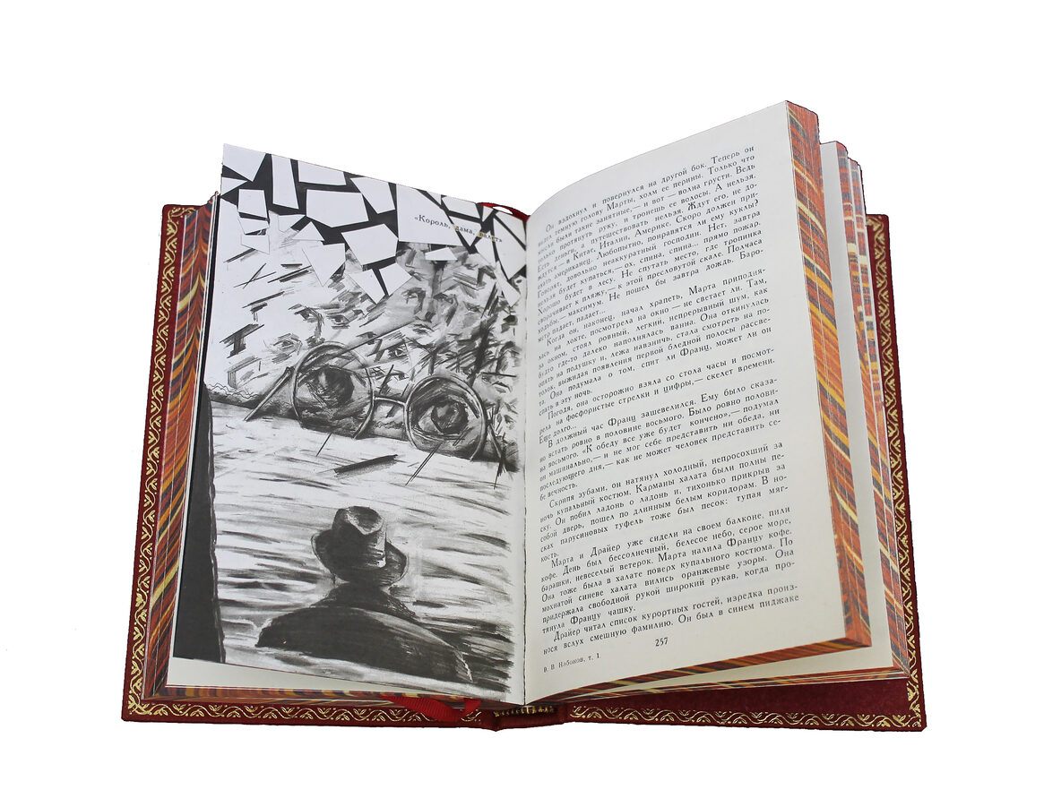 дополнен чёрно-белыми иллюстрациями. Обрез оформлен в технике "Перо павлина". Ляссе из