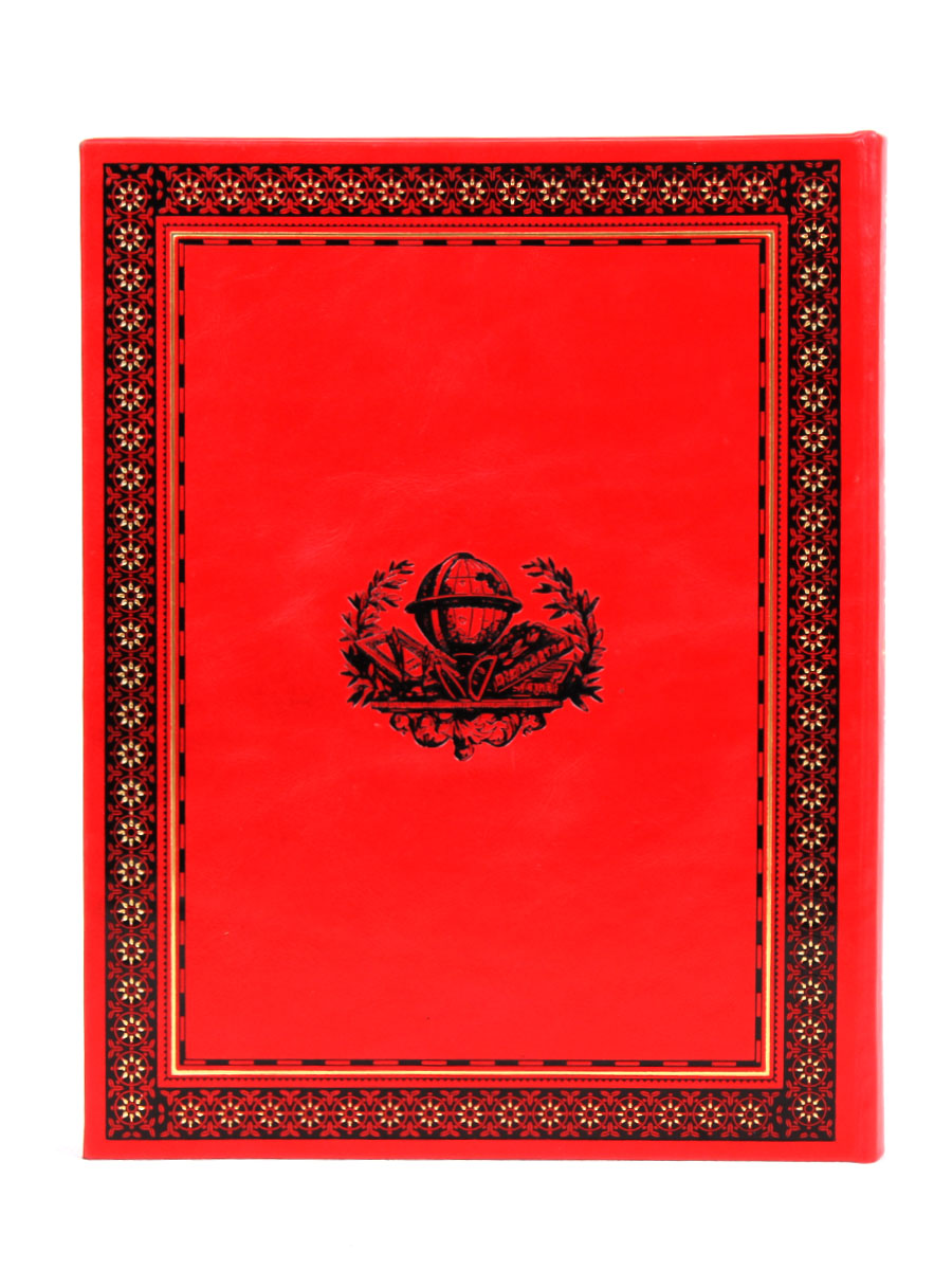Цельнокожаный переплёт ручной работы, украшен цветной кожаной вставкой, а также цветным и