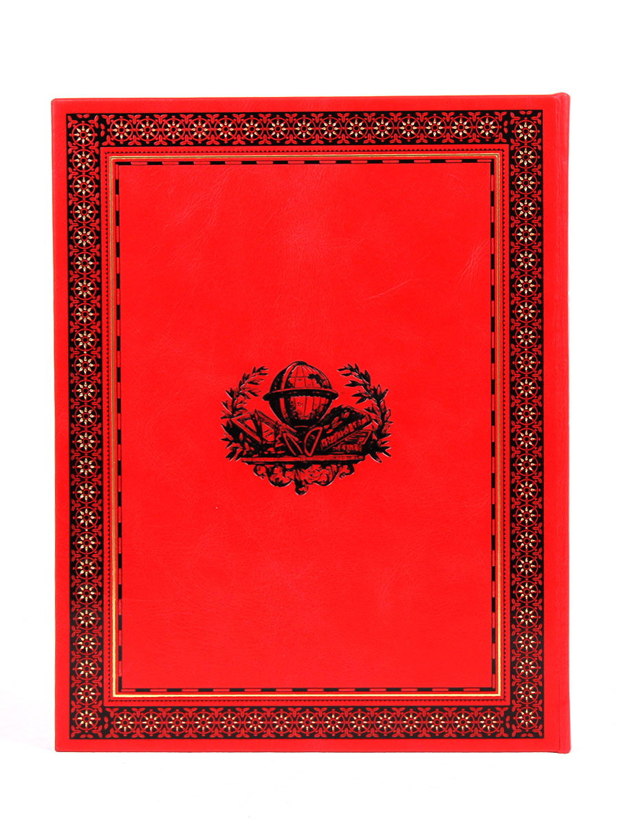 Цельнокожаный переплёт ручной работы, украшен цветной кожаной вставкой, а также цветным и