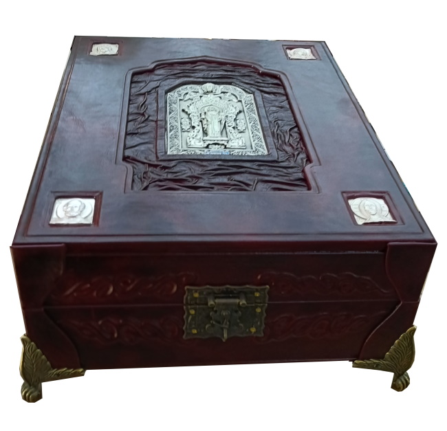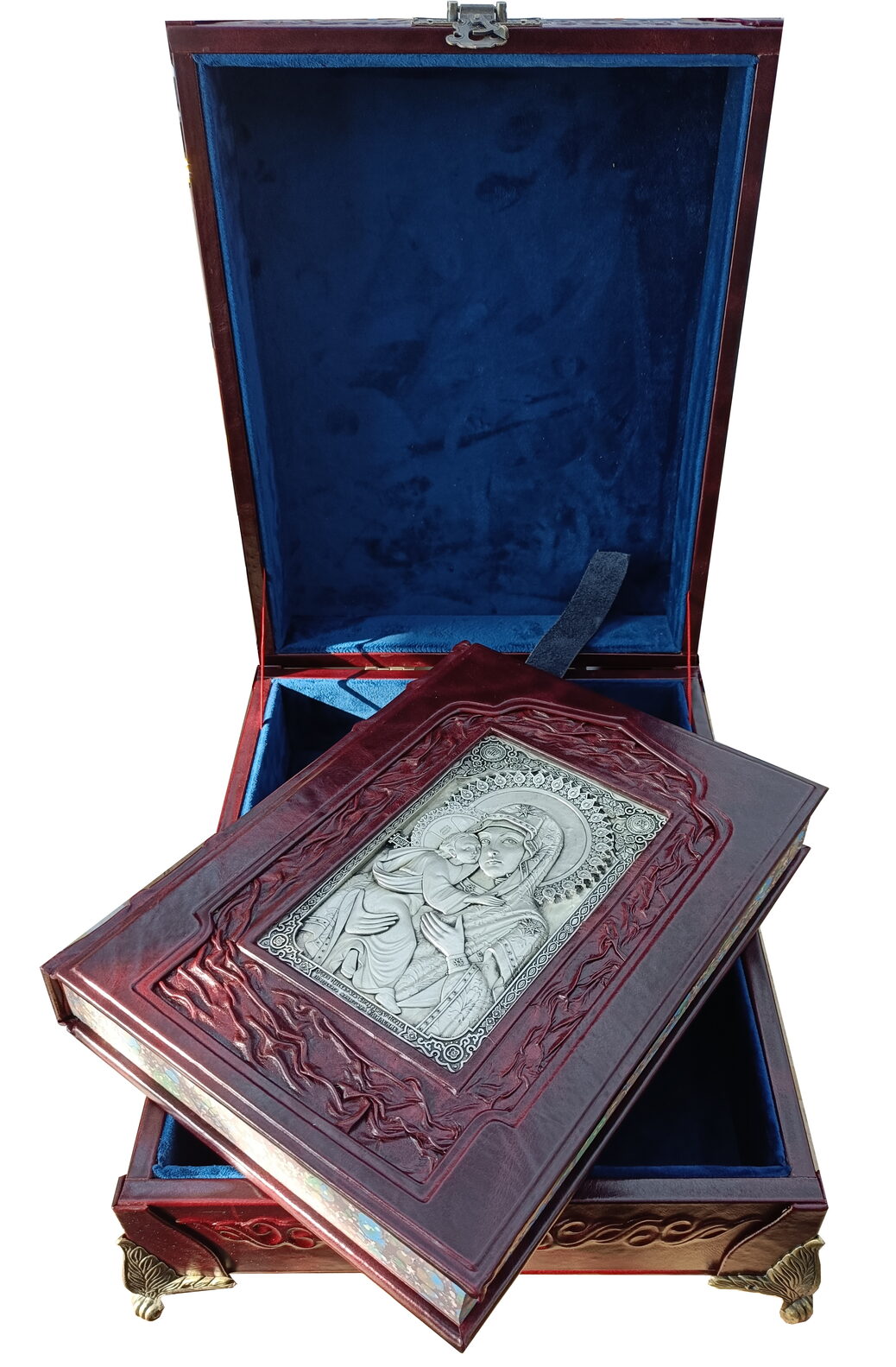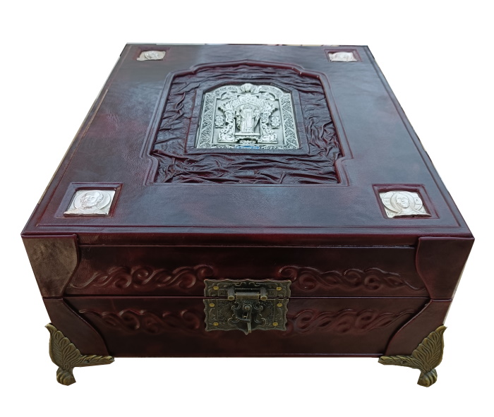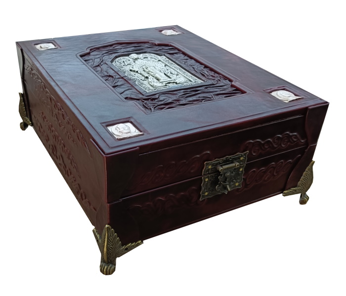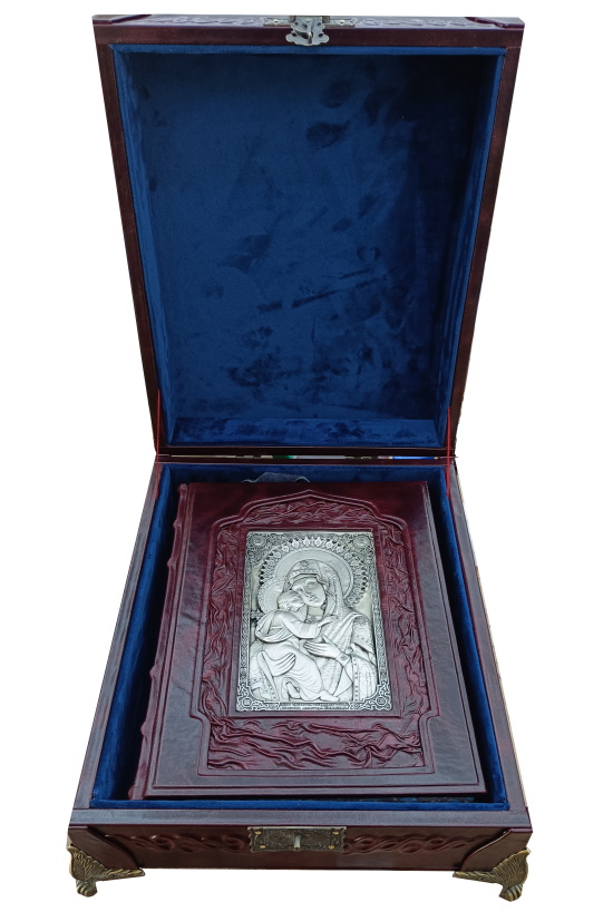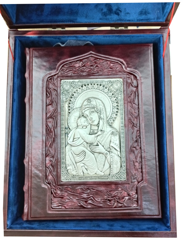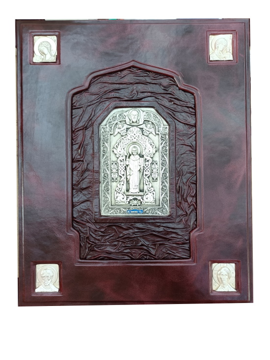Искусство, обращенное к вечности, воплощено в соответствующем роскошном облике. Наше эксклюзивное издание выполнено в цельнокожаном переплете ручной работы, стилизованном под оклады древних икон. Книга помещена в специально изготовленный подарочный футляр, защищающий и подчеркивающий ее ценность. Высокое качество полиграфии и продуманный дизайн делают это издание образцом элитные издания книг. Такие книги в коже — идеальный подарок для человека, ценящего русскую культуру и веру, способный стать фамильной реликвией и украсить библиотеку самого взыскательного коллекционера.