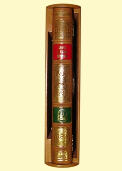 «Слово о полку Игореве», писанное и иллюстрированное выдающимся палехским мастером Иваном Голиковым, было выпущено издательством «Академия» тиражом 3300 экземпляров в 1934 году. Теперь это библиографическая редкость. Сохранность уцелевших экземпляров ужасная, так как все иллюстрации были покрыты каким-то экспериментальным лаком. В результате вся бумага «сгорела» и имеет тусклый ржавый вид. Цвета на полосных иллюстрациях не дают никакого представления о ярком таланте Голикова. Ни сканирование, ни реставрация невозможны. К счастью, сохранилось множество лаковых декоративных работ Голикова; поэтому сложную работу по восстановлению красоты мы осуществили следующим образом: взяли подлинные иллюстрации Голикова к «Слову» и отдали их иконописцу палехско-мстерской школы В. Немову, который на основании других работ Голикова «прописал» цветом заданные темы. Он не делал свою версию рисунка – в основе лежит подлинный оригинал, он просто профессиональной рукой вернул исконные цвета. Вот почему эта книга – уникальная работа, коллекционная и библиографическая драгоценность. Переплет ручной работы, самая дорогая бумага. Каждый экземпляр украшен масляными миниатюрами палехских мастеров по чистому золоту (такая технология не освоена больше нигде в мире), художественным литьем (серебро, чернение и золочение), самоцветами. Каждый экземпляр уникален и не повторяется. Обрезной формат 235 х 330. Бумага Acuarello avorio 280 грамм. Объём книги 108 полос. Французский переплёт ручной работы на трёх шнурах. Кожа натуральная (Италия). Каптал шелковый ручного плетения. Тиснение золотой фольгой. Обрез торшонированный. Форзац раздельный на кожаной слизуре. Украшения переплёта: ювелирное авторское литьё, белый металл (вес 158 граммов). Цветные ограненные фианиты и сердолики (8 камней). Авторская масляная миниатюра по чёрному лаку (Мстёра).